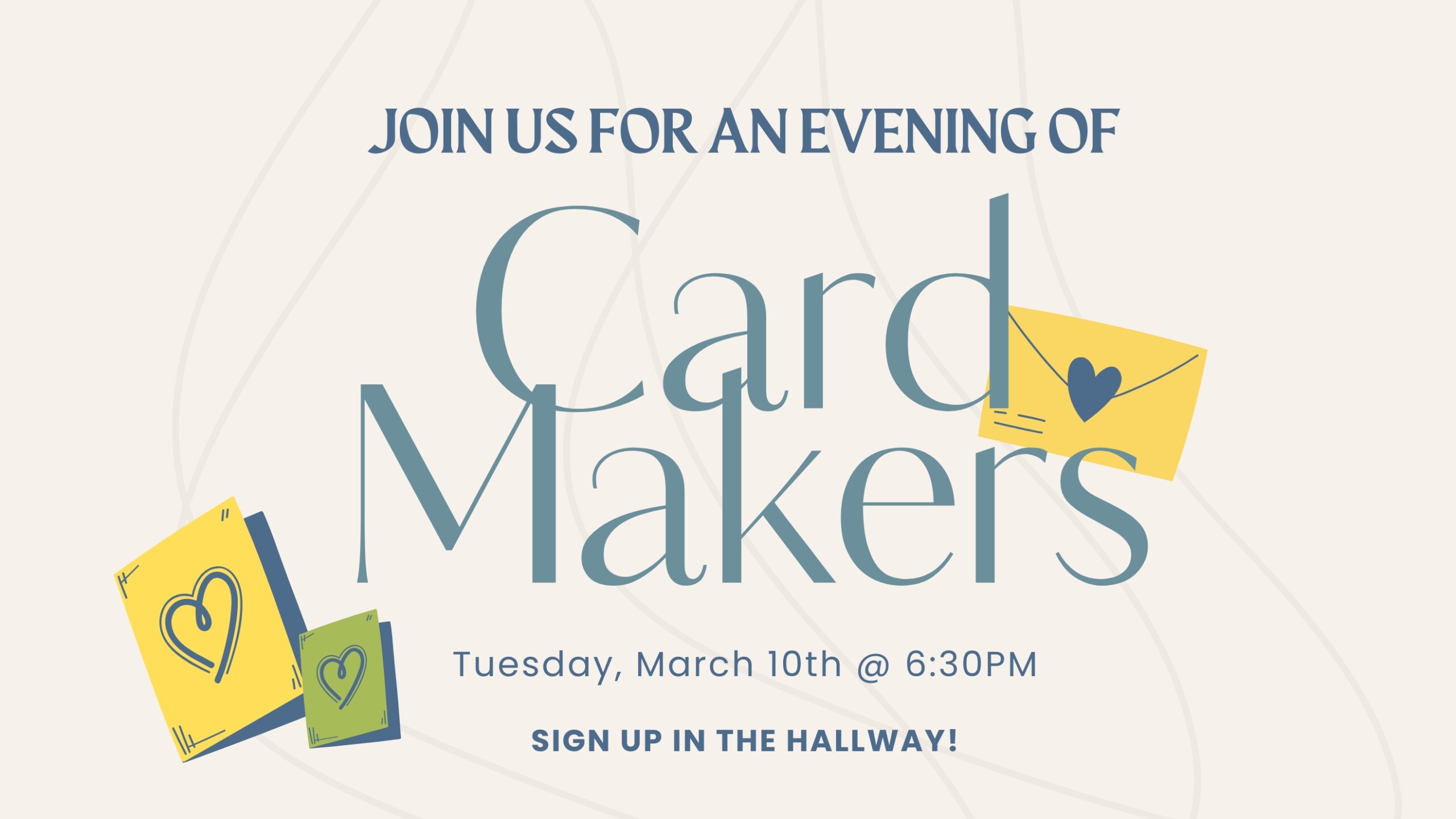 Join us for an evening of card making! We will provide the card set ups for you. Just bring yourself and be ready to make cards that you will be able to bless others with!